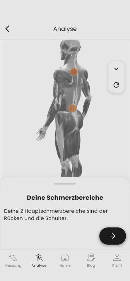 Wir erfassen nicht nur, wie sich dein Fuß beim Gehen bewegt, sondern auch, wie jeder deiner Schuhe diese Bewegung verändert. Aus beiden Informationen entsteht ein individuelles Korrekturprofil auf der Unterseite der Sohle. Es bringt deinen Körper in eine neutrale 0°-Ausrichtung und reduziert so Fehlbelastungen.